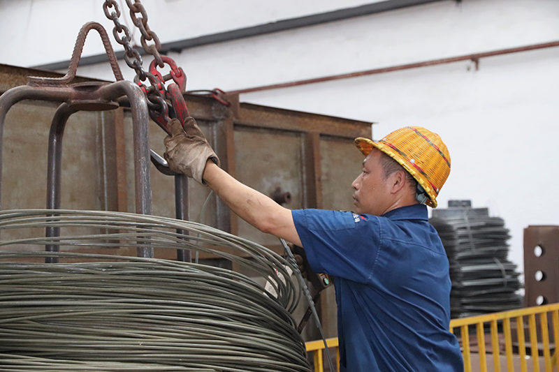 酸洗工无视暑气蒸腾,稳稳操作吊运线材,推进酸洗磷皂化工序高速运转。