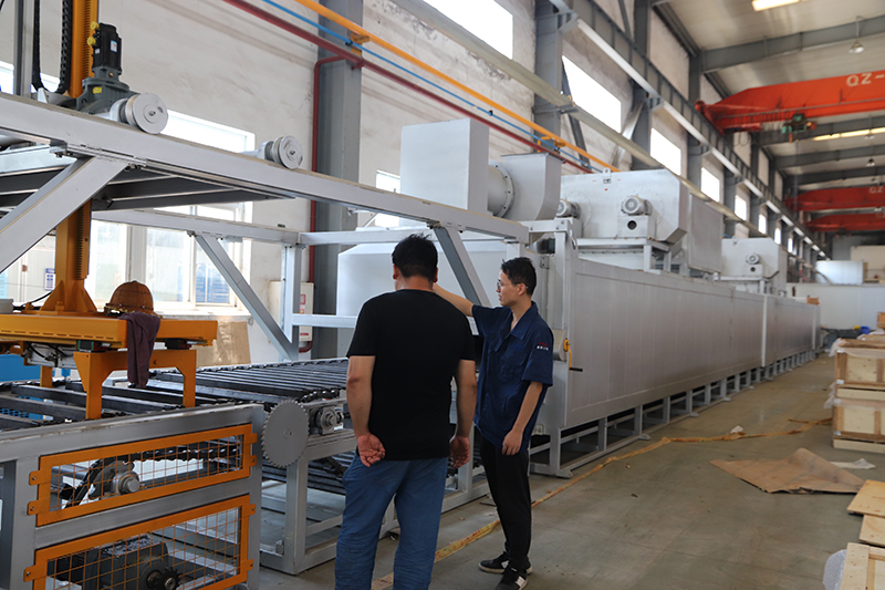 热处理车间网带炉散发灼热气浪,热处理工正抚平传送带上的产品,确保产品受热均匀。