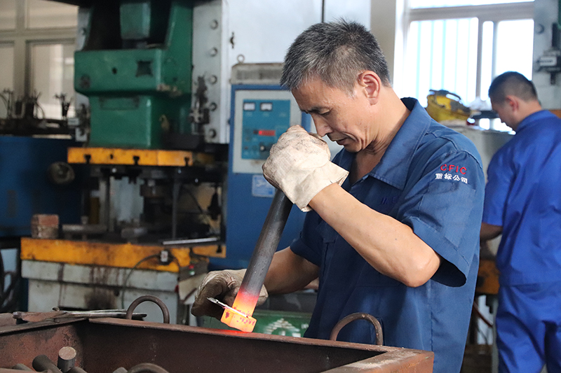 现场检验员在红镦工序400T压力机旁,贴近发烫工件,核查尺寸,守好质量关卡。