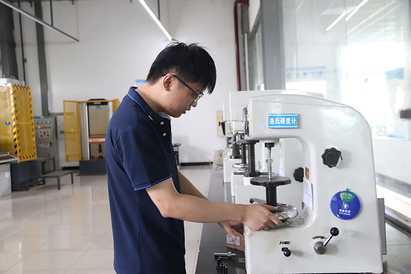 实验员正按操作规程将试样贴合洛氏硬度计压头下方,获取硬度实验数据。
